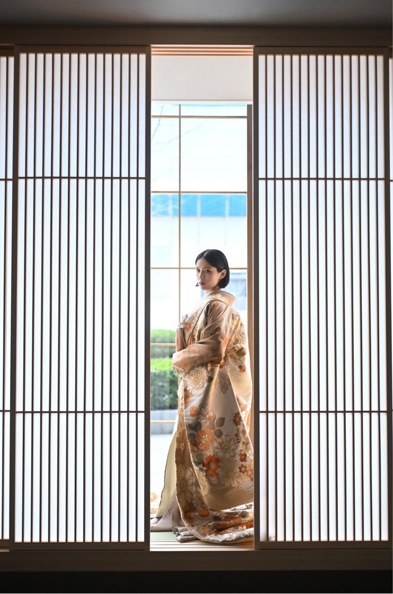 現代建築の美しさと日本の静けさを感じるデザインは、ウェディングドレスにも和装にも美しく調和し、花嫁の魅力をより引き立てます。